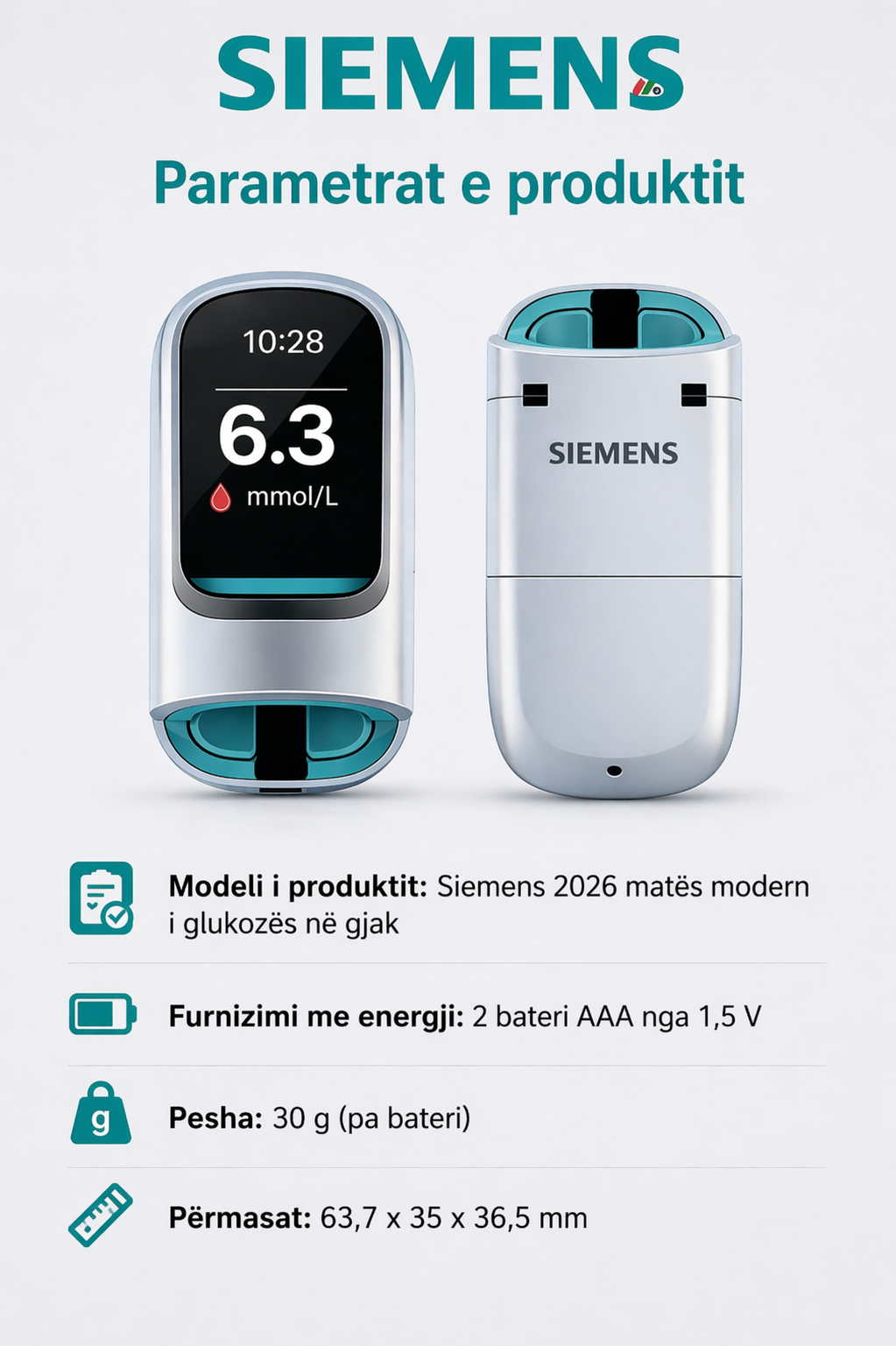 Siemens™ ka punuar për më shumë se 5 vjet në zhvillimin e këtij glukometri inovativ, jo-invaziv dhe multifunksional, i krijuar për ta bërë kontrollin e glicemisë më të thjeshtë, më të sigurt dhe pa dhimbje, duke ndihmuar në parandalimin e diabetit çdo ditë.