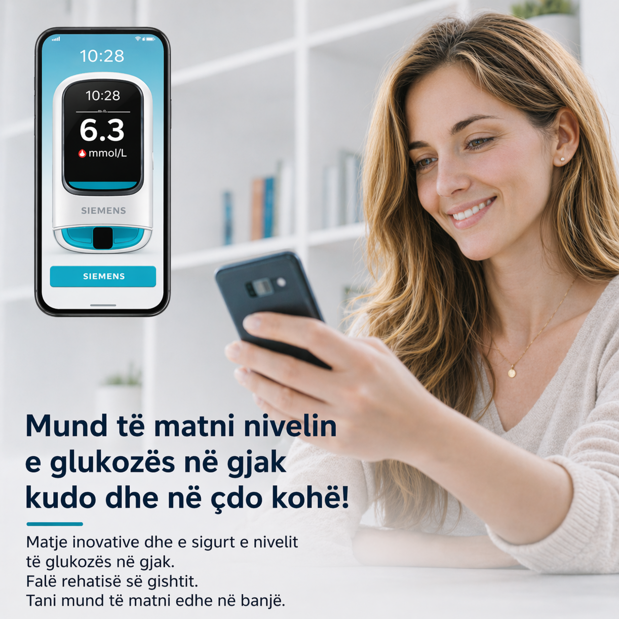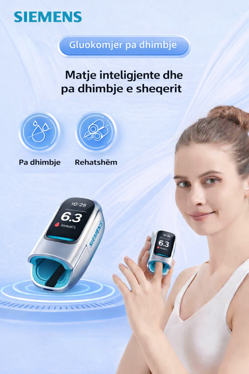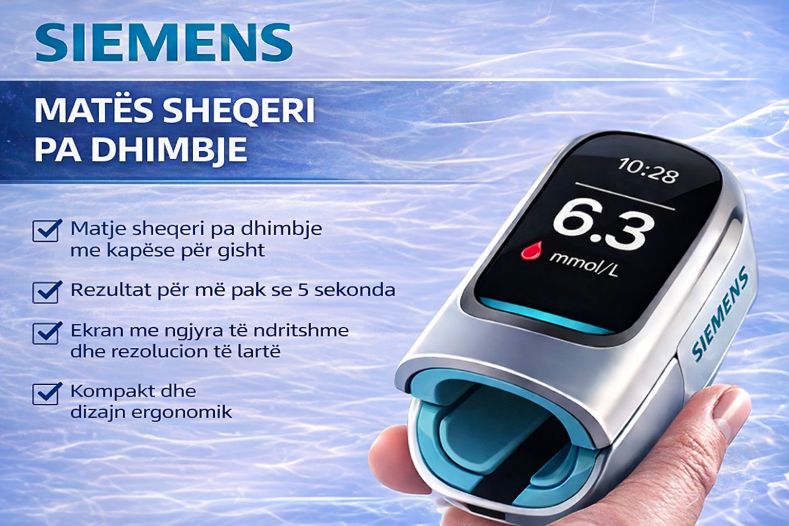 Klikoni menjëherë butonin “Bli tani” dhe merrni pajisjen Siemens™: për një përvojë matjeje të glicemisë të saktë, të shpejtë dhe plotësisht pa gjilpëra.
