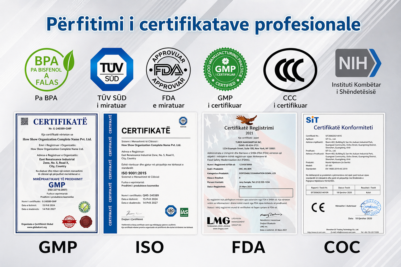 Certifikime ndërkombëtare – SHBA, CSA, FDA, ISO 13485, GMP, TÜV SÜD dhe CE.